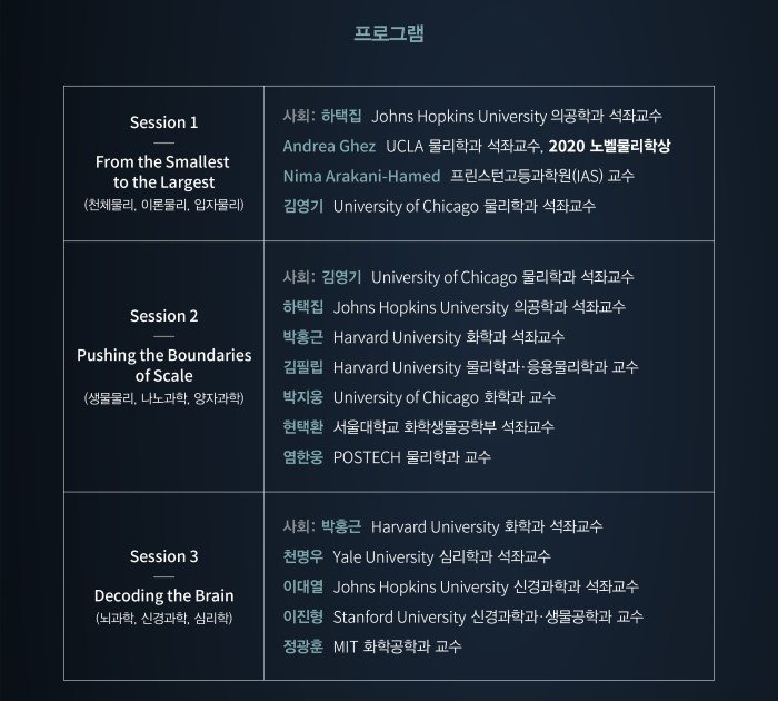 2020년 노벨물리학상 수상자인 Andre Ghez를 비롯하여 박홍근교수(하버드대), 김필립교수(하버드대), 김영기교수(시카고대), 박지웅교수(시카고대), 하택집교수(JHU), 천명우 교수(예일대), 이대열교수(JHU), 이진형교수(스탠포드대), 정광훈교수(MIT), 현택환교수(서울대), 염한웅교수(포스텍) 등이 주제발표와 토론을 이어갑니다.